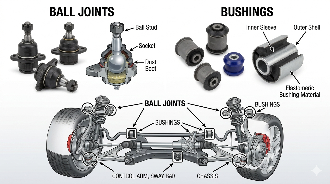 Det tidigaste varningstecknet för sviktande kulleder och bussningar är onormalt ljud - speciellt klunkande, gnisslande eller knackande ljud från den främre upphängningen vid körning över gupp eller under svängning i låg hastighet. Att tidigt inse skillnaden mellan kulledsfel och bussningsbrott förhindrar både säkerhetsrisker och kaskadskador på däck, inriktning och styrkomponenter.